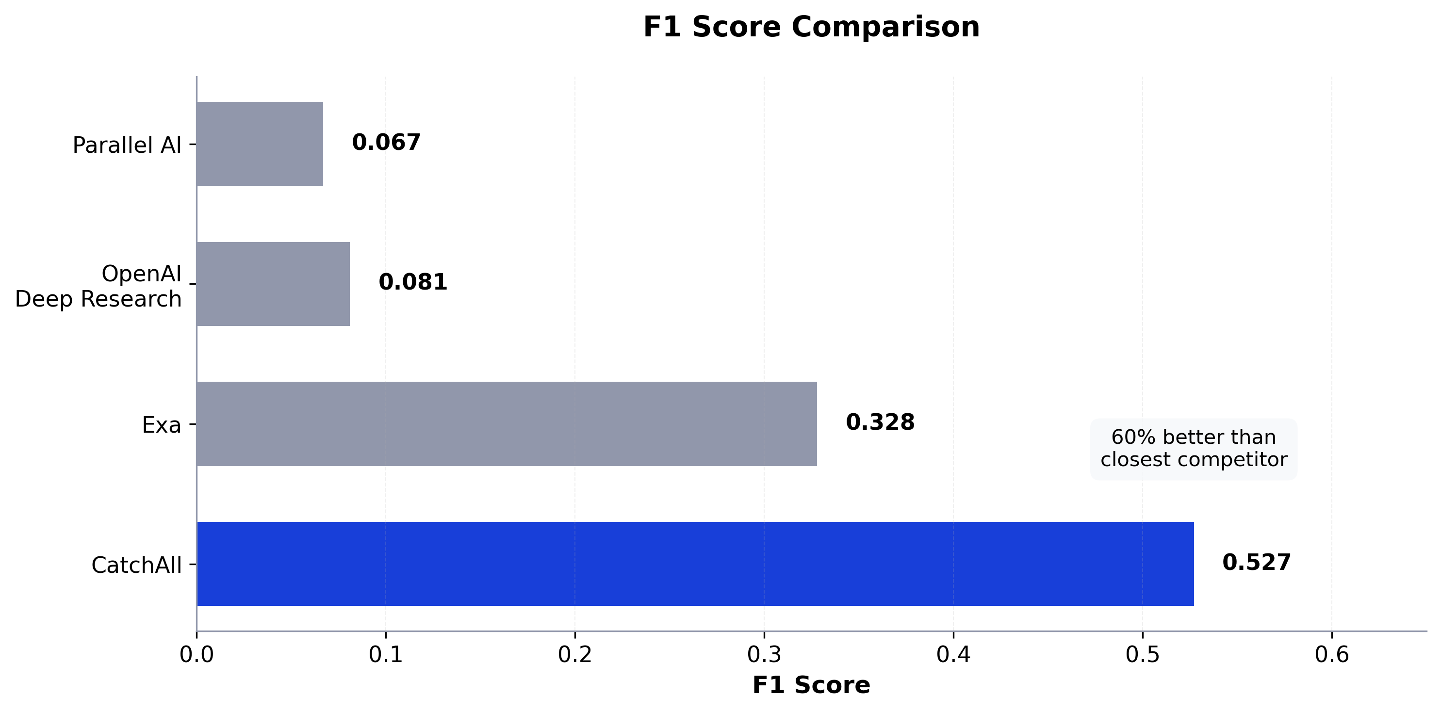 Our results: Across 35 queries, CatchAll achieved 94.5% uniqueness—higher than Exa (71.5%) and Parallel AI (67.6%), though slightly behind OpenAI Deep Research's 97.4%. This proves that high recall doesn't require tolerating duplicates.