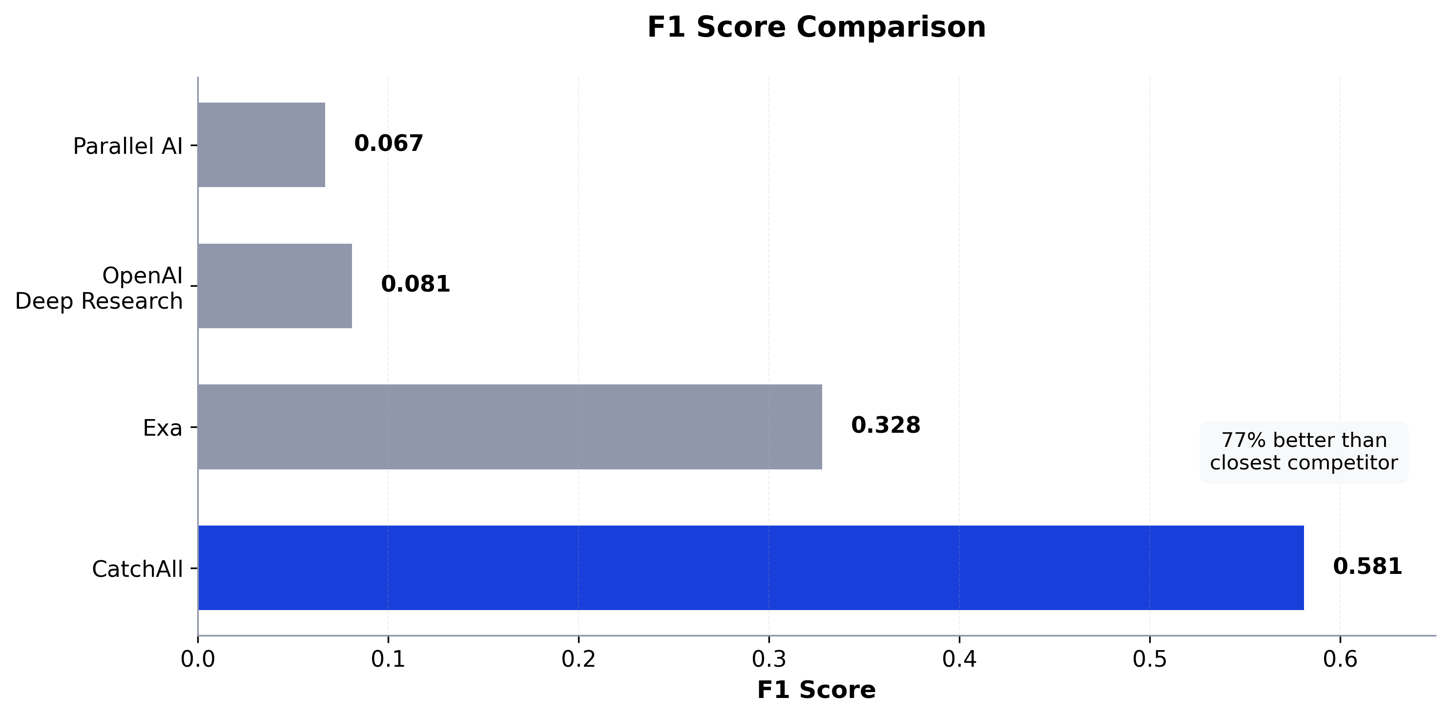 Our results: Across 35 queries, CatchAll achieved 94.5% uniqueness—higher than Exa (71.5%) and Parallel AI (67.6%), though slightly behind OpenAI Deep Research's 97.4%. This proves that high recall doesn't require tolerating duplicates.