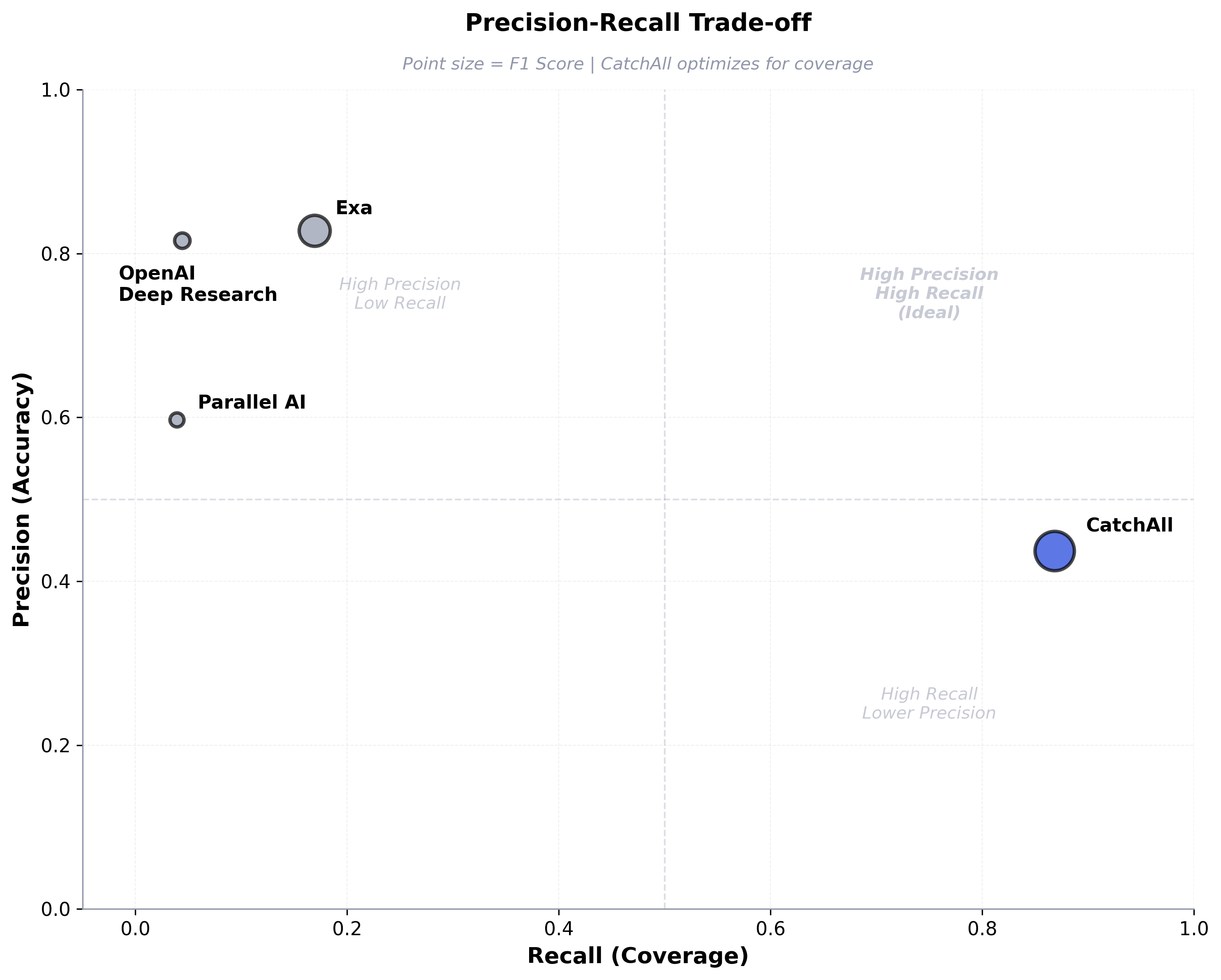 This is the complete story of how we benchmarked CatchAll against Exa Websets, Parallel AI FindAll, and OpenAI Deep Research using 35 real-world queries, rigorous evaluation methodology, and transparent reporting of limitations.