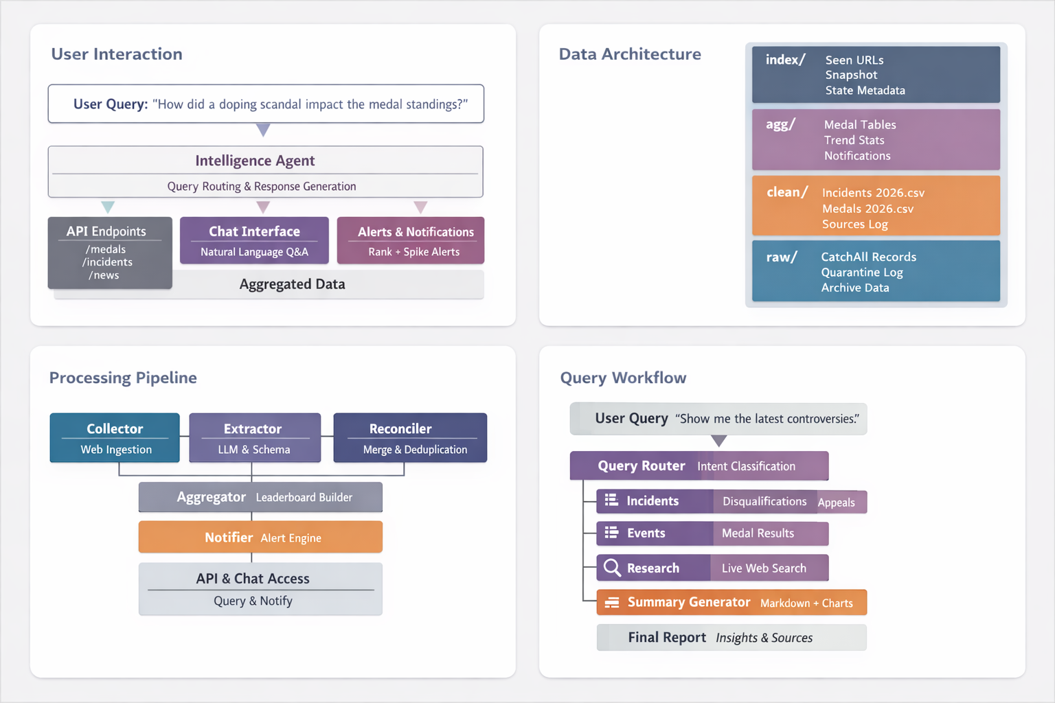- Collect: ingests Olympics coverage via Langchain-CatchAll on-demand or on a schedule.