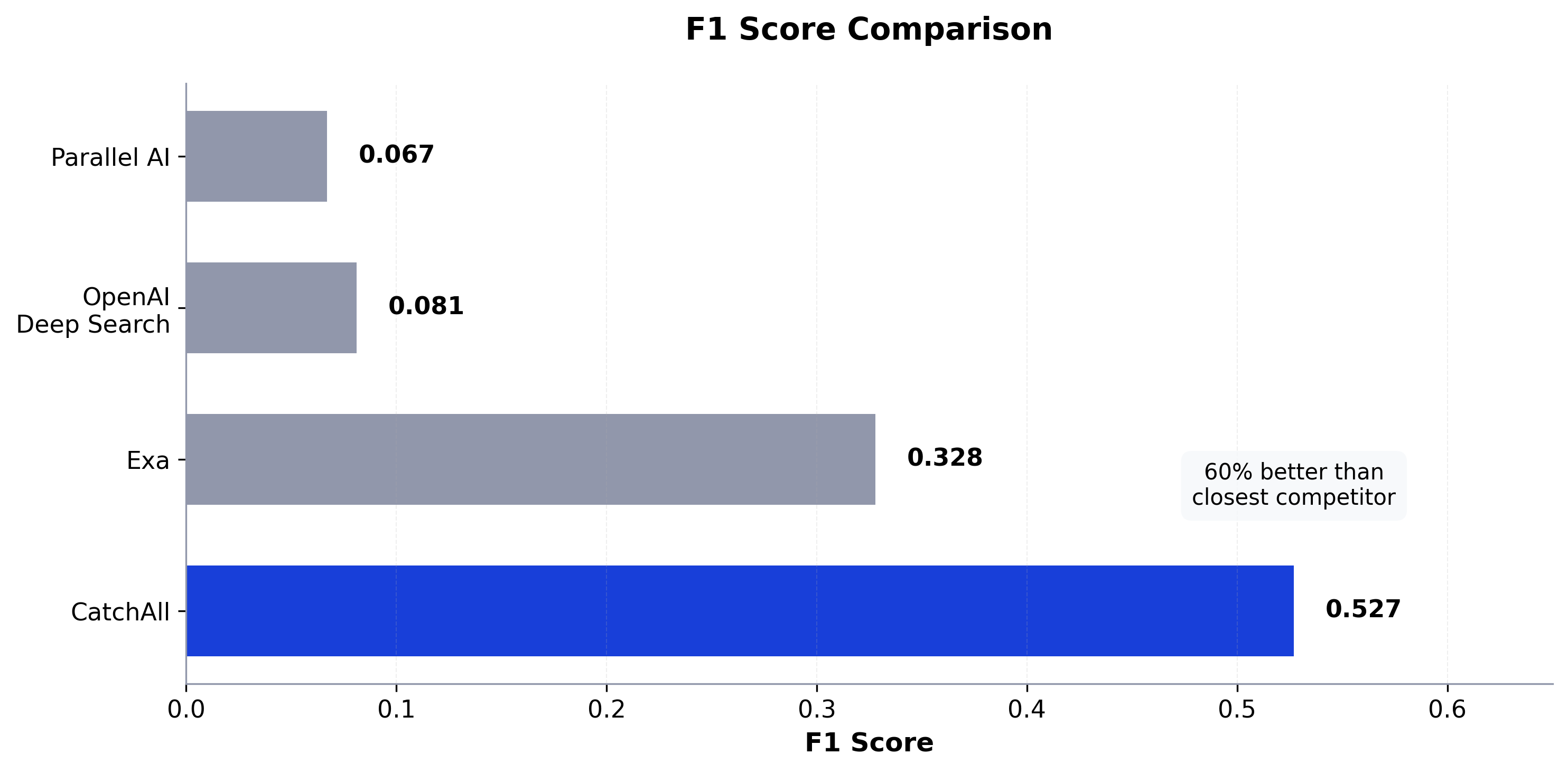 Our results: Across 35 queries, CatchAll achieved 94.5% uniqueness—higher than Exa (71.5%) and Parallel AI (67.6%), though slightly behind OpenAI Deep Research's 97.4%. This proves that high recall doesn't require tolerating duplicates.