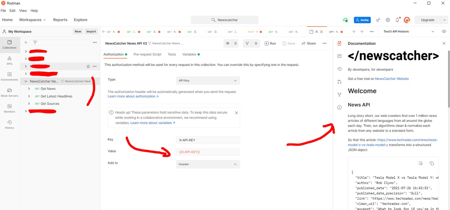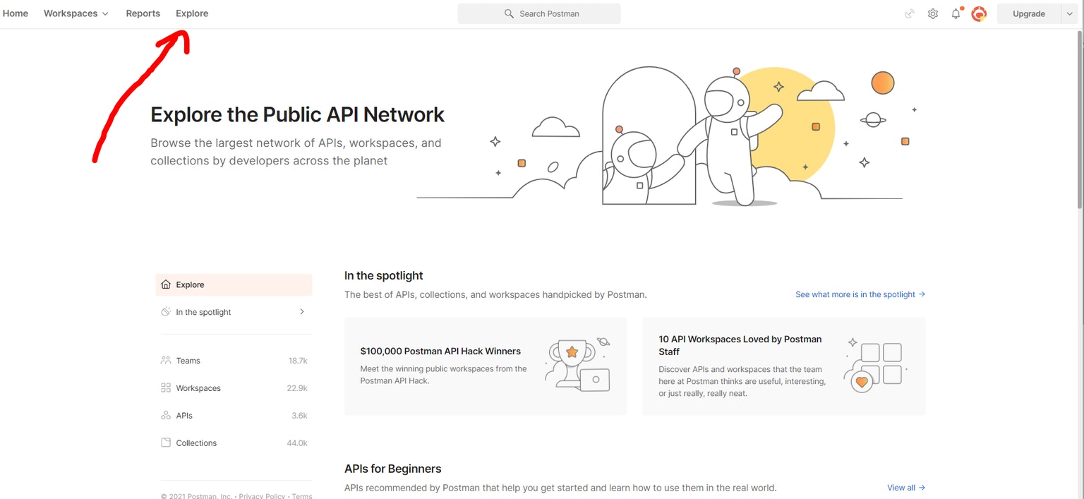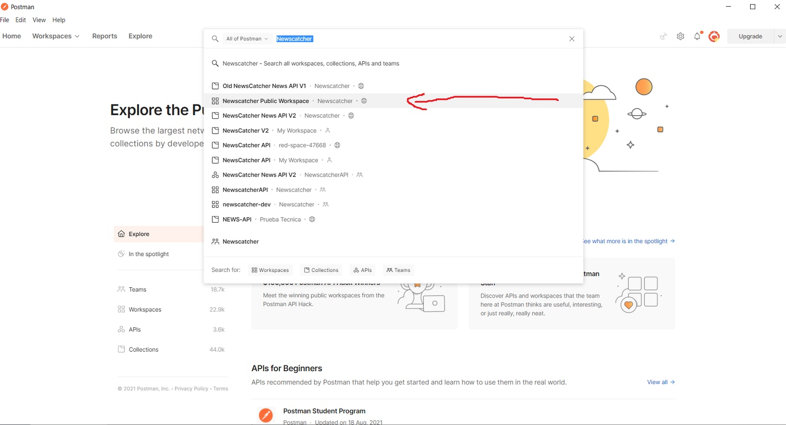 Before proceeding with Postman integration, be sure to register at app.newscatcherapi.com and get an API Key.Step 1: Log in Postman (via desktop application or website) and go to the “Explore” section